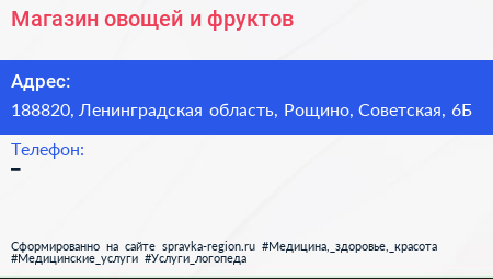 Магазин овощей и фруктов по адресу 188820, Ленинградская область, Рощино, Советская, 6Б в дальнейшем Организация, размещена в следующих категориях: