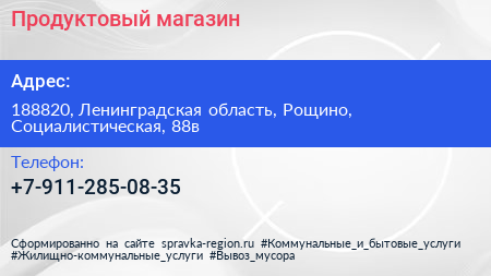 Продуктовый магазин по адресу 188820, Ленинградская область, Рощино, Социалистическая, 88в в дальнейшем Организация, размещена в следующих категориях: