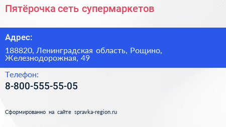 Пятёрочка, сеть супермаркетов по адресу 188820, Ленинградская область, Рощино, Железнодорожная, 49 в дальнейшем Организация, размещена в следующих категориях: