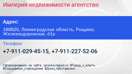 Империя недвижимости, агентство по адресу 188820, Ленинградская область, Рощино, Железнодорожная, 61а в дальнейшем Организация, размещена в следующих категориях: