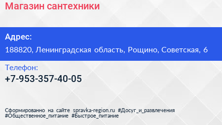 Магазин сантехники по адресу 188820, Ленинградская область, Рощино, Советская, 6 в дальнейшем Организация, размещена в следующих категориях: