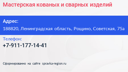 Мастерская кованых и сварных изделий по адресу 188820, Ленинградская область, Рощино, Советская, 75а в дальнейшем Организация, размещена в следующих категориях: