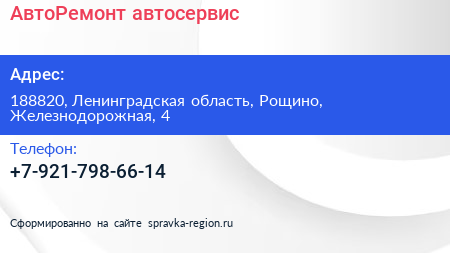 АвтоРемонт, автосервис по адресу 188820, Ленинградская область, Рощино, Железнодорожная, 4 в дальнейшем Организация, размещена в следующих категориях: