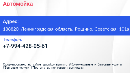 Автомойка по адресу 188820, Ленинградская область, Рощино, Советская, 101а в дальнейшем Организация, размещена в следующих категориях: