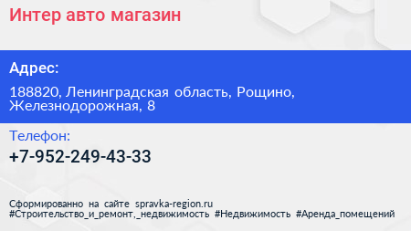 Интер-авто, магазин по адресу 188820, Ленинградская область, Рощино, Железнодорожная, 8 в дальнейшем Организация, размещена в следующих категориях: