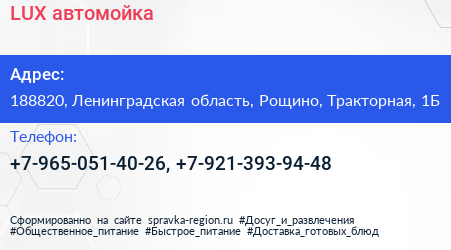 LUX, автомойка по адресу 188820, Ленинградская область, Рощино, Тракторная, 1Б в дальнейшем Организация, размещена в следующих категориях: