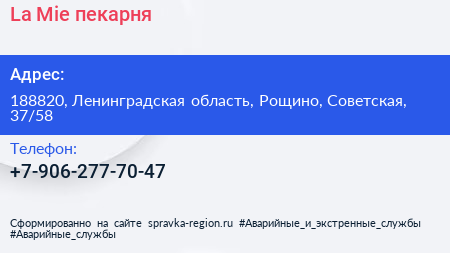 La Mie, пекарня по адресу 188820, Ленинградская область, Рощино, Советская, 37/58 в дальнейшем Организация, размещена в следующих категориях: