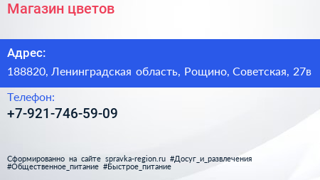 Магазин цветов по адресу 188820, Ленинградская область, Рощино, Советская, 27в в дальнейшем Организация, размещена в следующих категориях: