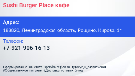 Sushi & Burger Place, кафе по адресу 188820, Ленинградская область, Рощино, Кирова, 1г в дальнейшем Организация, размещена в следующих категориях: