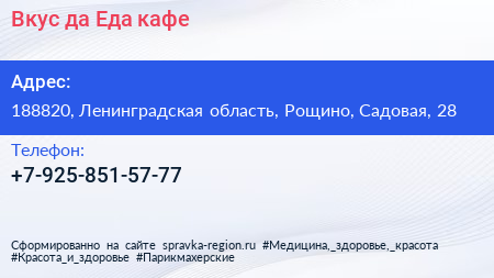 Вкус да Еда, кафе по адресу 188820, Ленинградская область, Рощино, Садовая, 28 в дальнейшем Организация, размещена в следующих категориях: