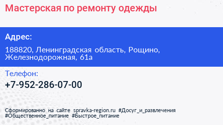 Мастерская по ремонту одежды по адресу 188820, Ленинградская область, Рощино, Железнодорожная, 61а в дальнейшем Организация, размещена в следующих категориях: