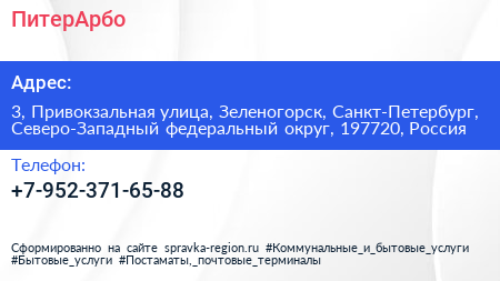 ПитерАрбо по адресу 3, Привокзальная улица, Зеленогорск, Санкт-Петербург, Северо-Западный федеральный округ, 197720, Россия в дальнейшем Организация, размещена в следующих категориях: