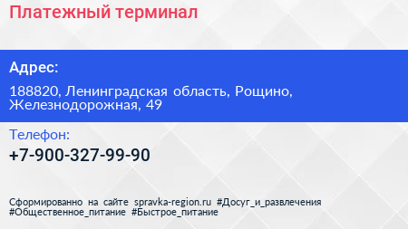 Платежный терминал по адресу 188820, Ленинградская область, Рощино, Железнодорожная, 49 в дальнейшем Организация, размещена в следующих категориях: