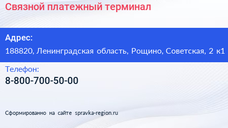 Связной, платежный терминал по адресу 188820, Ленинградская область, Рощино, Советская, 2 к1 в дальнейшем Организация, размещена в следующих категориях: