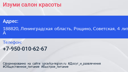 Изуми, салон красоты по адресу 188820, Ленинградская область, Рощино, Советская, 4 лит А в дальнейшем Организация, размещена в следующих категориях: