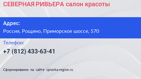 СЕВЕРНАЯ РИВЬЕРА, салон красоты по адресу Банк Санкт-Петербург, 570 литЕ, Приморское шоссе, Коттеджный поселок "Янтарный", Зеленогорск, Санкт-Петербург, Северо-Западный федеральный округ, 197720, Россия в дальнейшем Организация, размещена в следующих категориях: