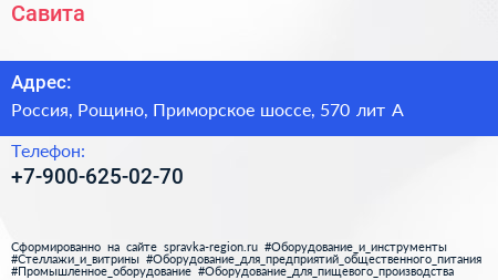 Савита по адресу Северная Ривьера, 570 литА, Приморское шоссе, Коттеджный поселок "Янтарный", Зеленогорск, Санкт-Петербург, Северо-Западный федеральный округ, 197720, Россия в дальнейшем Организация, размещена в следующих категориях: