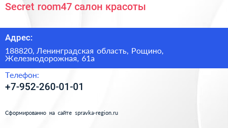 Secret room47, салон красоты по адресу 188820, Ленинградская область, Рощино, Железнодорожная, 61а в дальнейшем Организация, размещена в следующих категориях:
