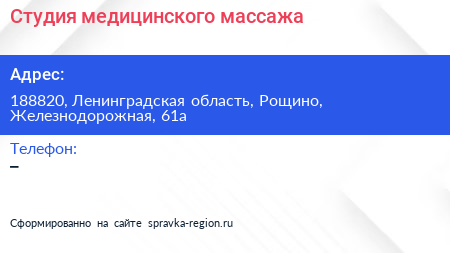 Студия медицинского массажа по адресу 188820, Ленинградская область, Рощино, Железнодорожная, 61а в дальнейшем Организация, размещена в следующих категориях: