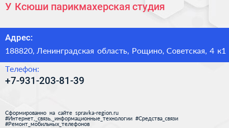У Ксюши, парикмахерская студия по адресу 188820, Ленинградская область, Рощино, Советская, 4 к1 в дальнейшем Организация, размещена в следующих категориях: