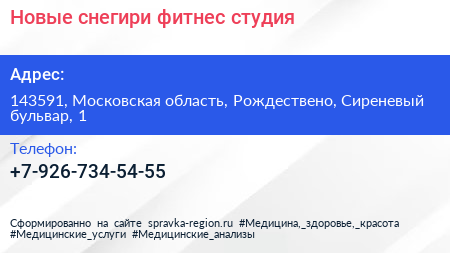 Новые снегири, фитнес-студия по адресу 143591, Московская область, Рождествено, Сиреневый бульвар, 1 в дальнейшем Организация, размещена в следующих категориях:
