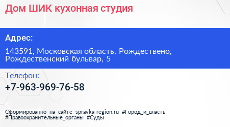 Дом ШИК, кухонная студия по адресу 143591, Московская область, Рождествено, Рождественский бульвар, 5 в дальнейшем Организация, размещена в следующих категориях: