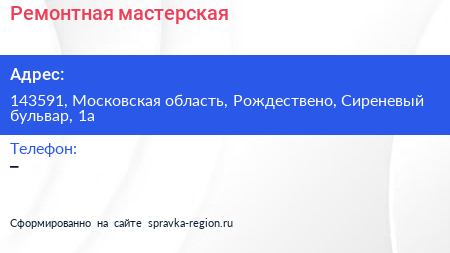 Ремонтная мастерская по адресу 143591, Московская область, Рождествено, Сиреневый бульвар, 1а в дальнейшем Организация, размещена в следующих категориях: