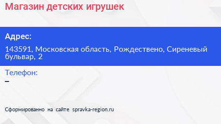 Магазин детских игрушек по адресу 143591, Московская область, Рождествено, Сиреневый бульвар, 2 в дальнейшем Организация, размещена в следующих категориях: