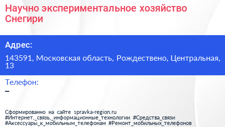 Научно-экспериментальное хозяйство Снегири по адресу 143591, Московская область, Рождествено, Центральная, 13 в дальнейшем Организация, размещена в следующих категориях: