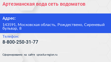 Артезианская вода, сеть водоматов по адресу 143591, Московская область, Рождествено, Сиреневый бульвар, 8 в дальнейшем Организация, размещена в следующих категориях: