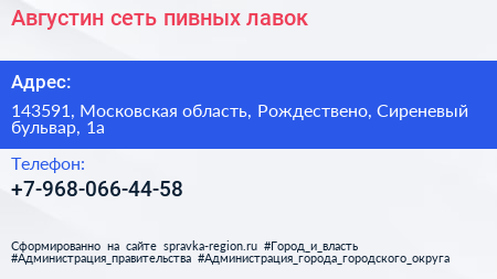 Августин, сеть пивных лавок по адресу 143591, Московская область, Рождествено, Сиреневый бульвар, 1а в дальнейшем Организация, размещена в следующих категориях: