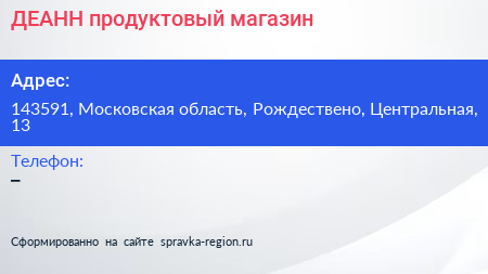 ДЕАНН, продуктовый магазин по адресу 143591, Московская область, Рождествено, Центральная, 13 в дальнейшем Организация, размещена в следующих категориях: