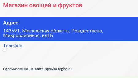Магазин овощей и фруктов по адресу 143591, Московская область, Рождествено, Микрорайонная, вл1Б в дальнейшем Организация, размещена в следующих категориях: