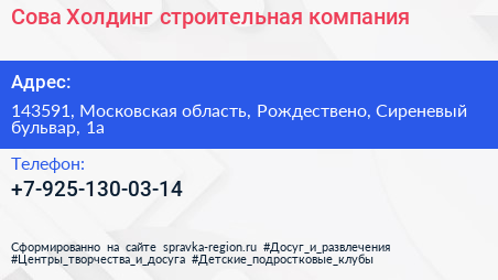 Сова-Холдинг, строительная компания по адресу 143591, Московская область, Рождествено, Сиреневый бульвар, 1а в дальнейшем Организация, размещена в следующих категориях: