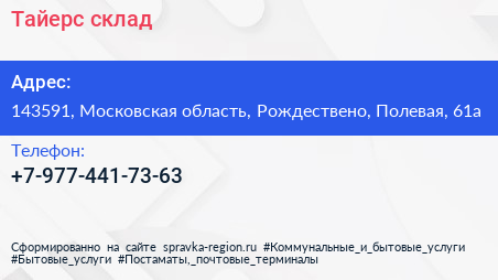 Тайерс-склад по адресу 143591, Московская область, Рождествено, Полевая, 61а в дальнейшем Организация, размещена в следующих категориях: