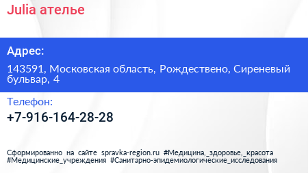 Julia, ателье по адресу 143591, Московская область, Рождествено, Сиреневый бульвар, 4 в дальнейшем Организация, размещена в следующих категориях:
