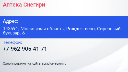 Аптека-Снегири по адресу 143591, Московская область, Рождествено, Сиреневый бульвар, 6 в дальнейшем Организация, размещена в следующих категориях: