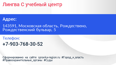 Лингва-С, учебный центр по адресу 143591, Московская область, Рождествено, Рождественский бульвар, 5 в дальнейшем Организация, размещена в следующих категориях: