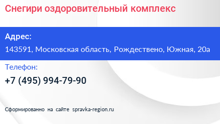Снегири, оздоровительный комплекс по адресу 143591, Московская область, Рождествено, Южная, 20а в дальнейшем Организация, размещена в следующих категориях: