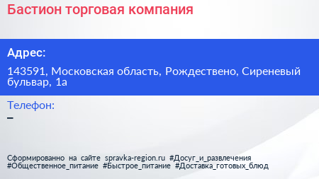 Бастион, торговая компания по адресу 143591, Московская область, Рождествено, Сиреневый бульвар, 1а в дальнейшем Организация, размещена в следующих категориях: