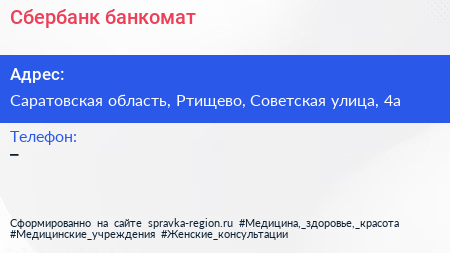 Сбербанк, банкомат по адресу Саратовская область, Ртищево, Советская улица, 4а в дальнейшем Организация, размещена в следующих категориях: