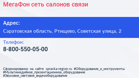 МегаФон, сеть салонов связи по адресу Саратовская область, Ртищево, Советская улица, 2 в дальнейшем Организация, размещена в следующих категориях: