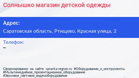 Солнышко, магазин детской одежды по адресу Саратовская область, Ртищево, Красная улица, 2 в дальнейшем Организация, размещена в следующих категориях: