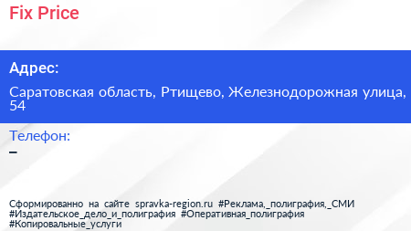 Fix Price по адресу Саратовская область, Ртищево, Железнодорожная улица, 54 в дальнейшем Организация, размещена в следующих категориях: