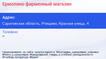 Ермолино, фирменный магазин по адресу Саратовская область, Ртищево, Красная улица, 4 в дальнейшем Организация, размещена в следующих категориях:
