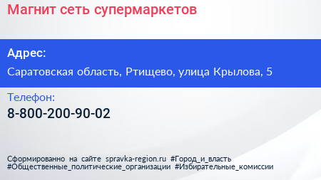 Магнит, сеть супермаркетов по адресу Саратовская область, Ртищево, улица Крылова, 5 в дальнейшем Организация, размещена в следующих категориях: