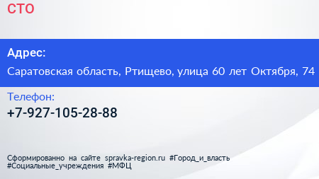 СТО по адресу Саратовская область, Ртищево, улица 60 лет Октября, 74 в дальнейшем Организация, размещена в следующих категориях: