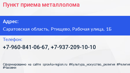 Пункт приема металлолома по адресу Саратовская область, Ртищево, Рабочая улица, 1Б в дальнейшем Организация, размещена в следующих категориях: