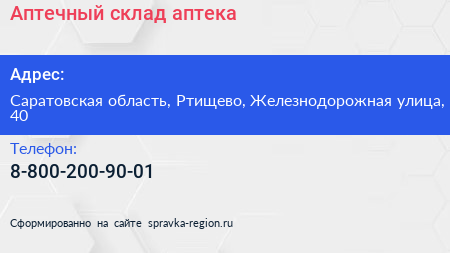 Аптечный склад, аптека по адресу Саратовская область, Ртищево, Железнодорожная улица, 40 в дальнейшем Организация, размещена в следующих категориях: