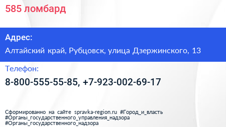 585, ломбард по адресу Алтайский край, Рубцовск, улица Дзержинского, 13 в дальнейшем Организация, размещена в следующих категориях: